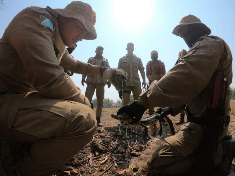 Militares do Corpo de Bombeiros de Mato Grosso do Sul resgataram um filhote de jacaré em meio aos incêndios que destroem o Pantanal na região de Poconé, no Mato Grosso, nesta segunda-feira (31). O animal estava bastante debilitado e foi devolvido a única área com água no município, o Rio São Lourenço.