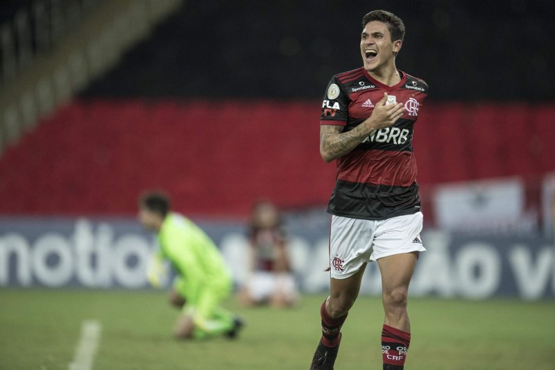 Pedro jogador do Flamengo comemora seu gol durante partida contra o Goiás no estádio Maracanã pelo campeonato Brasileiro A 2020. (Foto: Estadão Conteúdo)