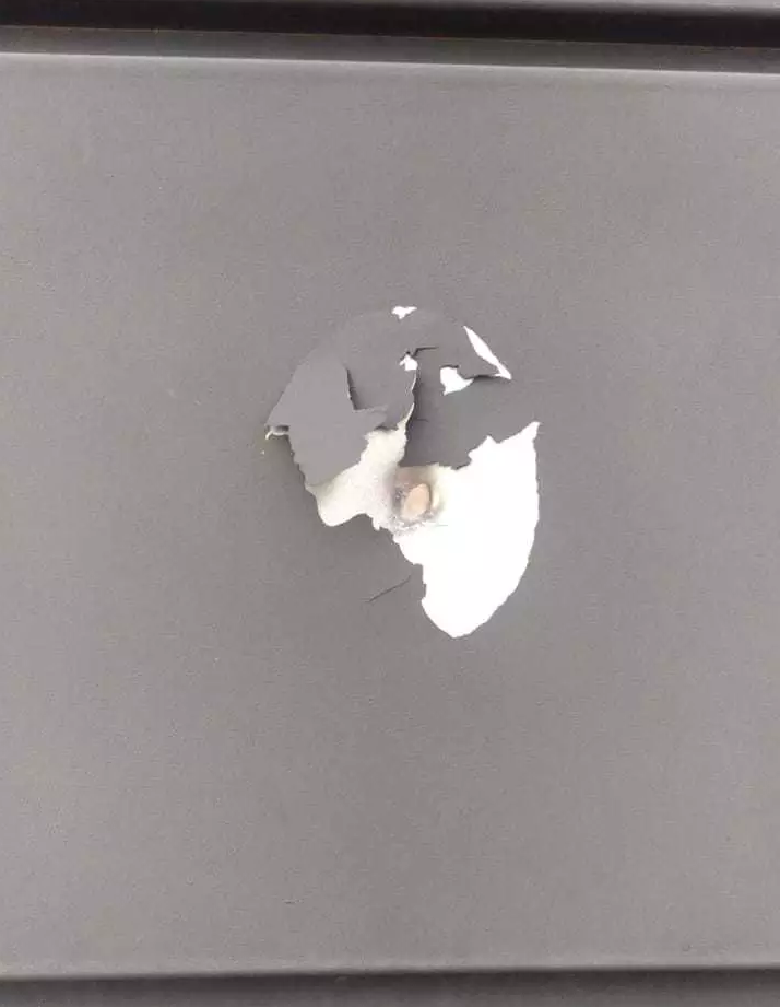 Marca de um dos tiros no portão eletrônico do condomínio Nápoles. (Foto: Direto das Ruas)