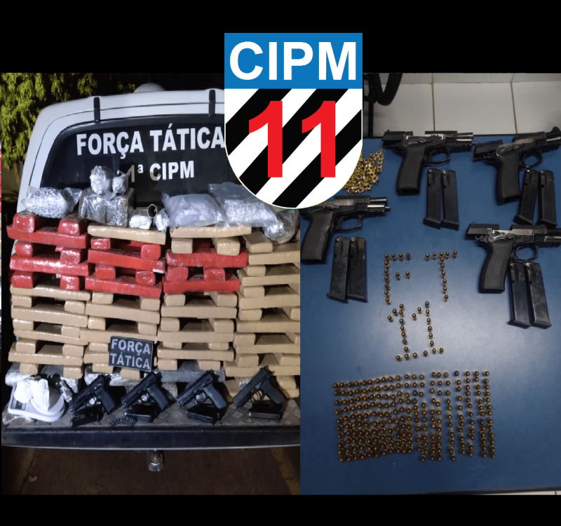 Policiais Militares do pelotão da Força Tática 11ª Companhia Independente de Polícia Militar apreenderam na noite ontem (01/12), mais de 119kg de maconha, 4 pistolas com 8 carregadores e 259 munições, além de fugitivo de penitenciaria no Paraguai.