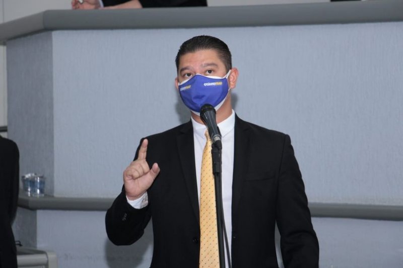 PraCegoVer: Fotografia. Vereador Otávio Trad, de camisa branca, terno preto e gravata amarela, está usando máscara azul e branca enquanto fala ao microfone no plenário da Câmara Municipal de Campo Grande. Fim da descrição.