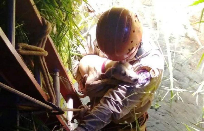 De acordo com informações do site Ivinotícias, moradores acionaram equipe depois de o animal cair na área, que está desativada. Para entrar no local, militares usaram cordas e uma escada. Em imagens, é possível ver o momento em que a cadela é retirada do local.