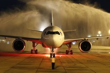 O avião foi recebido na pista por um batismo simbólico, com jatos de água lançados em forma de arco pelos bombeiros do Aeroporto Rio-Galeão.