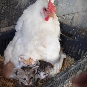 O fazendeiro e policial Goran A. Surchi foi surpreendido quando ouviu miados em seu galinheiro, no Iraque. Depois de investigar de onde vinha o ruído, descobriu que uma de suas galinhas havia adotado três filhotes de gato após a mãe deles morrer.