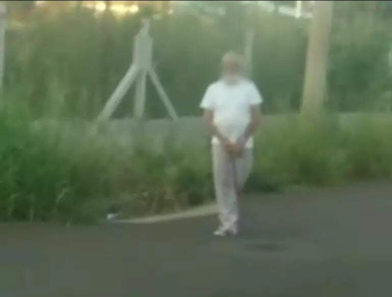 Idoso fechando o zíper da calça após ser flagrado praticando zoofilia com cachorro. (Foto: Direto das Ruas)