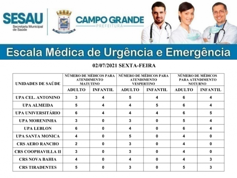 Confira a escala médica de plantão nas UPAs e CRSs nesta sexta-feira, dia 02 de julho de 2021.