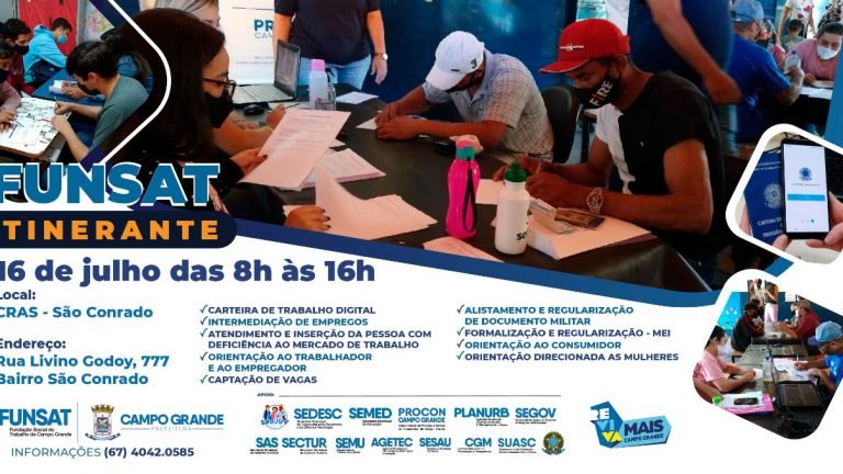 A Fundação Social do Trabalho (Funsat) juntamente com secretarias retoma a ação Funsat Itinerante na sexta-feira (16), a edição será no Bairro Jardim São Conrado. O evento vai acontecer das 08h às 16h no CRAS São Conrado. A ação oferecerá diversos serviços à população.