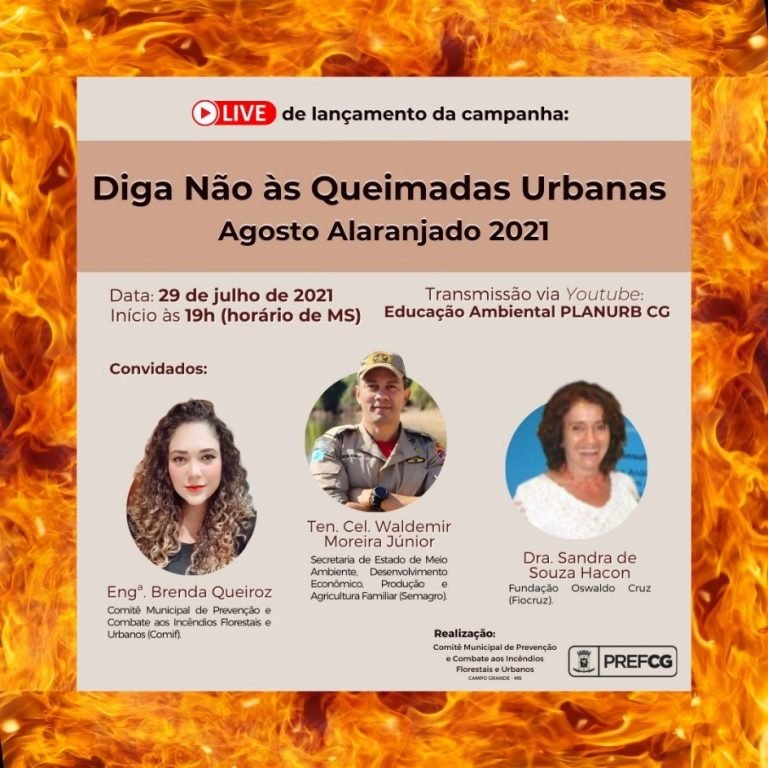 O lançamento da Campanha será realizado virtualmente no canal “Educação Ambiental Planurb CG”, no Youtube, e contará com três palestras: “Apresentação sobre o Comitê Municipal de Prevenção e Combate aos Incêndios Florestais e Urbanos”, ministrada pela representante da Agência Municipal de Meio Ambiente e Planejamento Urbano (Planurb), no COMIF, Eng. Brenda Queiroz. “Ações de combate, prevenção e manejo do fogo no Município de Campo Grande”, ministrada pelo Ten. Cel. Waldemir Moreira Júnior, da Secretaria de Estado de Meio Ambiente, Desenvolvimento Econômico, Produção e Agricultura Familiar (SEMAGRO); e, “Os impactos das queimadas na saúde”, ministrada pela Prof. Dra. Sandra de Souza Hacon, da Fundação Oswaldo Cruz – Rio de Janeiro (Fiocruz).