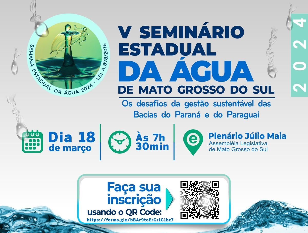 Por proposição do deputado estadual Renato Câmara (MDB), coordenador da Frente Parlamentar de Recursos Hídricos da Assembleia Legislativa de Mato Grosso do Sul (ALEMS), será realizado o V Seminário Estadual da Água.