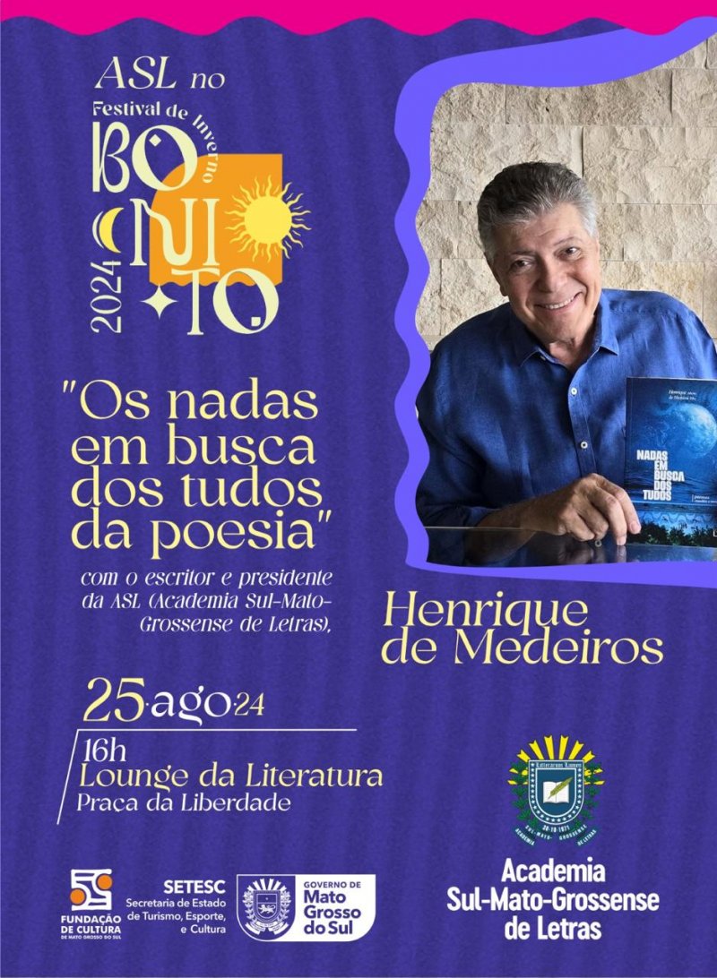 A Academia Sul-Mato-Grossense de Letras participa do Festival de Inverno de Bonito 2024 em bate-papos e palestras com a presença dos imortais Henrique de Medeiros, Pedro Chaves e Rubenio Marcelo conversando sobre a ASL, literocultura, o lançamento de seus novos livros, a educação e a cultura. O encontro com Medeiros aborda – principalmente – seu recém-lançado livro, a antologia “Nadas em busca dos tudos”. A mediação do encontro com Henrique de Medeiros será feita pelo escritor, jornalista e músico Rodrigo Teixeira.