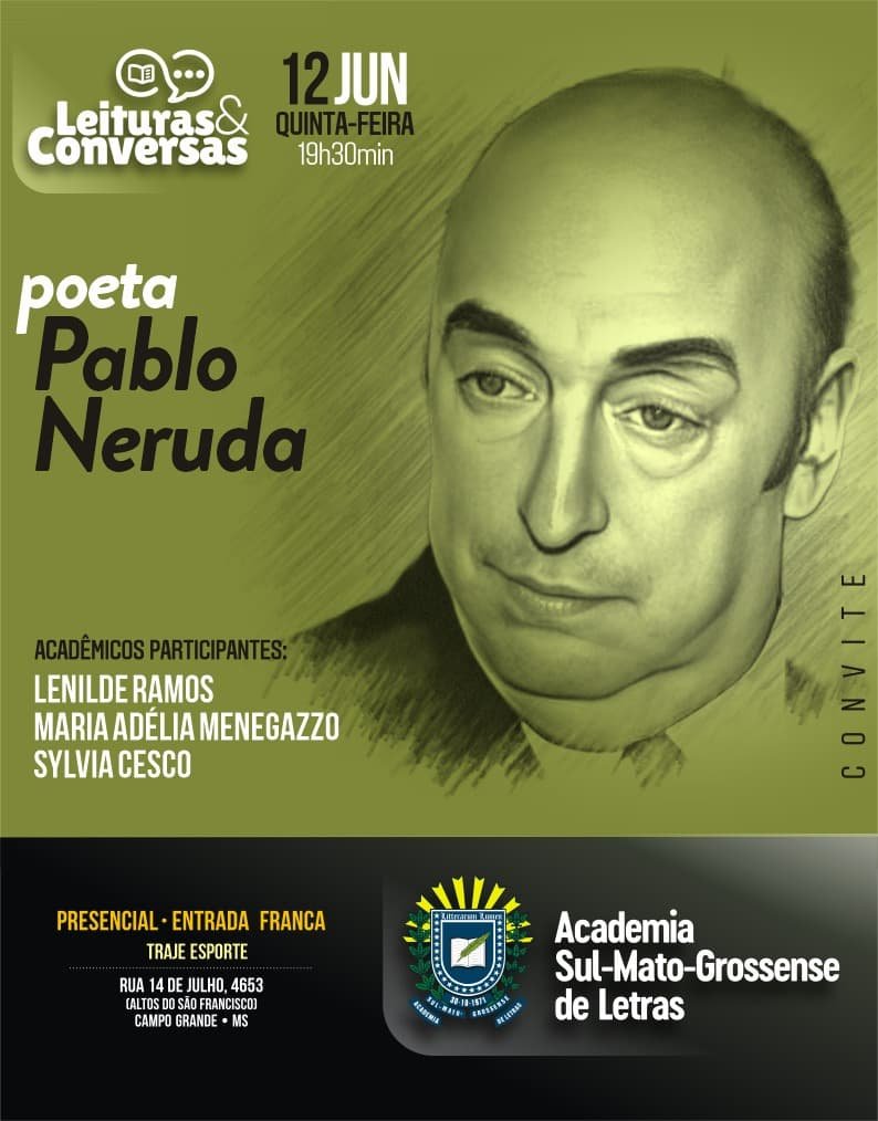 Com abordagens sobre a obra do escritor e poeta chileno Pablo Neruda, o projeto Leituras e Conversas na ASL terá sua sessão de junho nesta quinta-feira, dia 12, com entrada franca no auditório da instituição, às 19h30min. O “clube de leitura”, coordenado na Academia pelas imortais Lenilde Ramos, Maria Adélia Menegazzo e Sylvia Cesco discutirá a obra de um autor seminal na literatura latino-americana e mundial, que publicou aos 20 anos sua obra "Vinte Poemas de Amor e uma Canção Desesperada" – um marco da literatura hispano-americana.