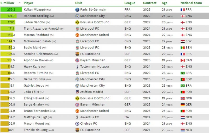 O mais jovem do top 20 é Alphonso Davies, do Bayern, superando o atacante Haaland, do Borussia Dortmund. Por posição, os mais caros são: Ederson, entre os goleiros; De Ligt, entre os zagueiros, Alexander-Arnold, entre os laterais; De Jong, entre os volantes; Bruno Fernandes, entre os meias; e Mbappé entre os atacantes.
