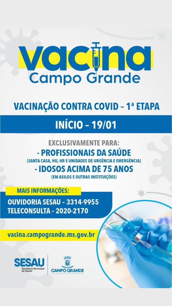 Para agilizar o processo de identificação das pessoas pertencentes aos grupos prioritários para imunização contra a COVID-19, a Prefeitura Municipal de Campo Grande, por meio da Secretaria Municipal de Saúde (Sesau) e da Agência Municipal de Tecnologia e Informação (Agetec), lançou o sistema de identificação prévia que pode ser acessado através do site: vacina.campogrande.ms.gov.br. Neste primeiro momento somente pessoas acima de 75 anos e profissionais de saúde podem fazer sua identificação.