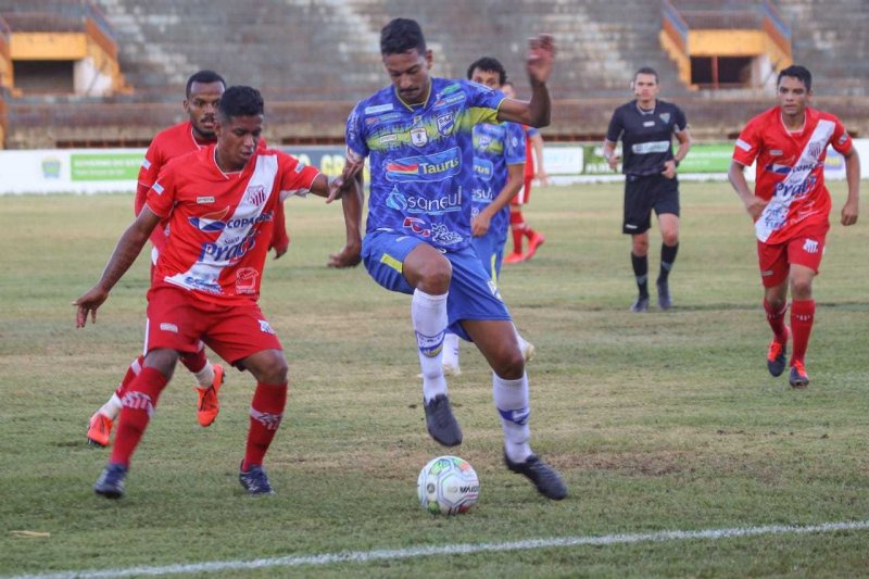 Jogador do Dourados, de uniforme azul, tenta escapar da marcação colorada (Foto: Franz Mendes)