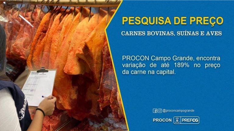 Pesquisa do Procon Campo Grande, realizada entre os dias 22 e 23 de julho de 2021, percorreu 18 estabelecimentos comerciais para fazer um levantamento dos preços praticados nos cortes das carnes bovina, suína e ave. Foram visitados nove casas de carne e nove supermercados. A maior margem percentual foi no corte de ave/ coração, que registrou uma diferença de 189%.