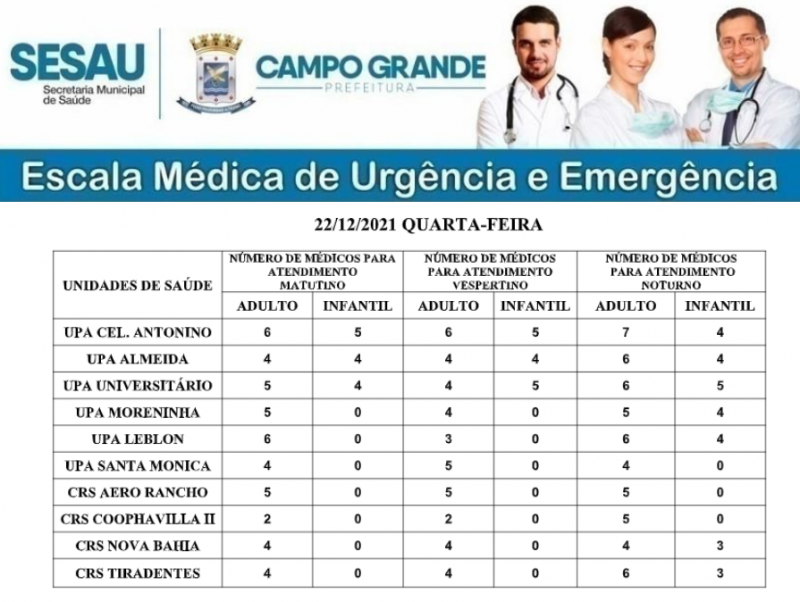 Confira a escala médica de plantão nas UPAs e CRSs nesta quarta-feira, dia 22 de dezembro de 2021.