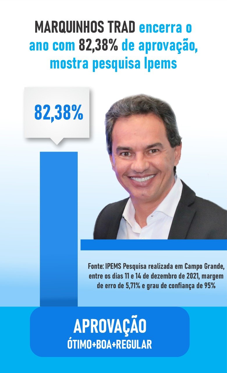 A atual gestão do prefeito Marquinhos Trad, na Prefeitura de Campo Grande, tem 82,38% de aprovação. Pesquisa DO Instituto de Pesquisas de Mato Grosso do Sul (Ipems) realizada na Capital, entre os dias 11 e 14 de dezembro de 2021, revela que 61,07% dos entrevistados consideram a administração ótima ou boa. Outros 21,31% consideram regular, porém aprovam a gestão. Em contrapartida, 17,62% dos entrevistados desaprovam a administração.
