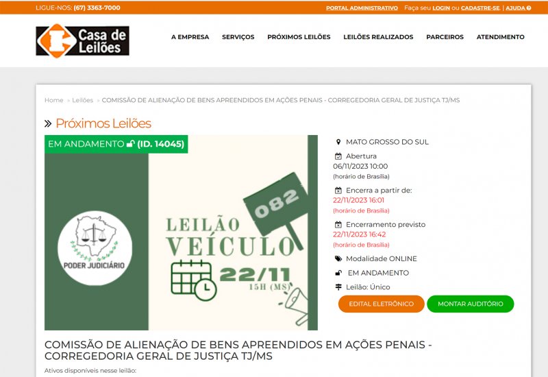 Foi finalizado nesta quarta-feira, dia 22 de novembro, o edital de leilão eletrônico nº 082/2023, da Corregedoria-Geral de Justiça do TJMS, com lotes de veículos passíveis de voltar a circular e apenas sucatas. Os lotes podem ser consultados pelo site www.casadeleiloes.com.br e os lances, exclusivamente on-line, estavam dispodiveis a até as 16 horas de ontem, no horário de Brasília.