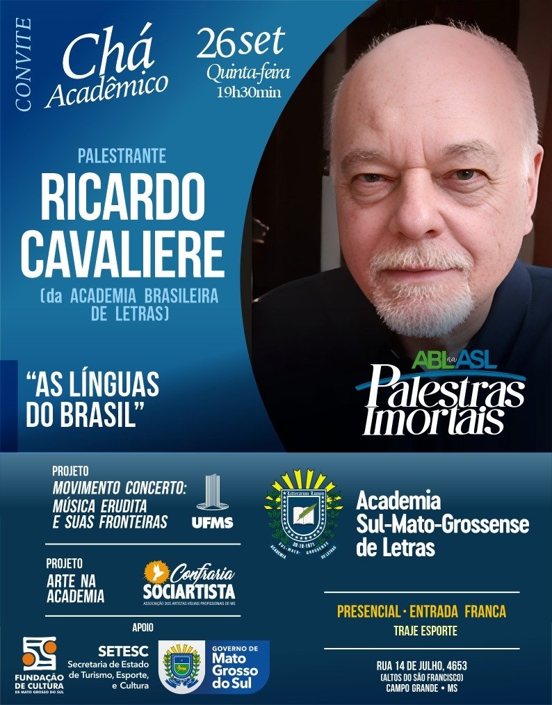 “As línguas do Brasil”: tema da palestra que o imortal da Academia Brasileira de Letras – ABL -, Ricardo Cavaliere, apresentará na Academia Sul-Mato-Grossense de Letras nesta quinta-feira, dia 26. Segundo Cavaliere, “será abordado o conceito de língua nacional e língua oficial, traçando paralelos sobre o cenário linguístico brasileiro da atualidade em que coexistem o português, as línguas indígenas e as línguas de imigrantes”. O evento faz parte do projeto “ABL na ASL: Palestras Imortais”, realizado pela Academia em parceria com a Setesc – Secretaria de Turismo, Esporte e Cultura pela Fundação de Cultura do Estado de Mato Grosso do Sul.
