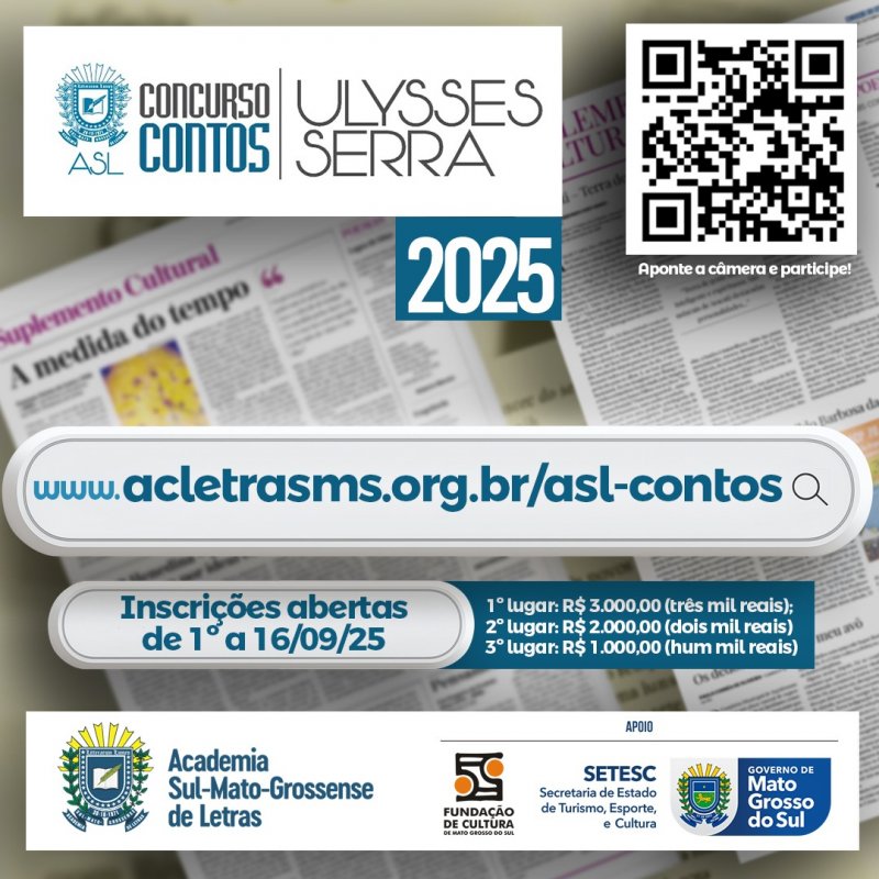 A Academia Sul-Mato-Grossense de Letras (ASL) lançou oficialmente a edição 2025 do Concurso de Contos “Ulysses Serra”, voltado exclusivamente a autores residentes em Mato Grosso do Sul. Com o objetivo de incentivar a produção literária regional, a iniciativa oferece prêmios em dinheiro que variam de R$ 1.000 a R$ 3.000. As inscrições são gratuitas e podem ser realizadas até o dia 16 de setembro de 2025, por meio do site acletrasms.org.br/asl-contos. O concurso conta com o apoio da Secretaria de Estado de Turismo, Desporto e Cultura, por meio da Fundação de Cultura de Mato Grosso do Sul (FCMS).
