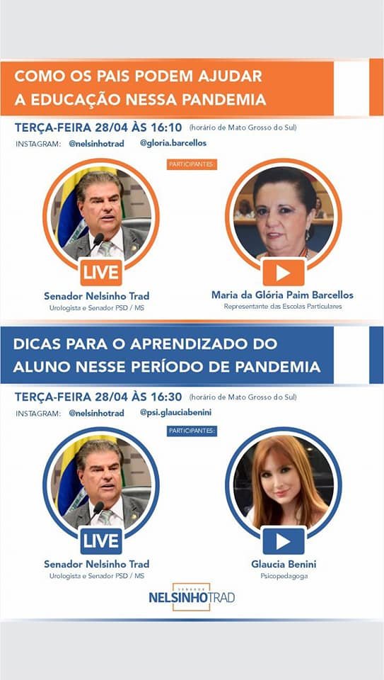 O senador Nelsinho Trad fará hoje duas lives sobre educação. A partir das 16h10 de MS, vai conversar com a representante das escolas particulares, professora Maria da Glória Paim Barcellos e, em seguida, com a psicopedagoga Glaucia Benini.