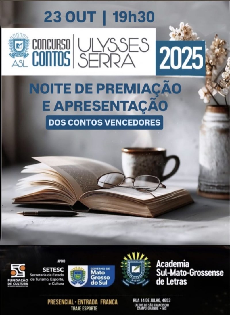 Na próxima quinta-feira, 23 de outubro, a Academia Sul-Mato-Grossense de Letras realiza a cerimônia de entrega dos prêmios do Concurso de Contos “Ulysses Serra”, iniciativa que visa fomentar a produção literária no Estado. Lançado em agosto, o certame atraiu participantes de todo o MS e revelou narrativas marcantes, que serão celebradas em uma noite especial de leitura e reconhecimento. O Concurso teve apoio da Secretaria de Estado de Turismo, Desporto e Cultura, pela Fundação de Cultura de Mato Grosso do Sul – FCMS.