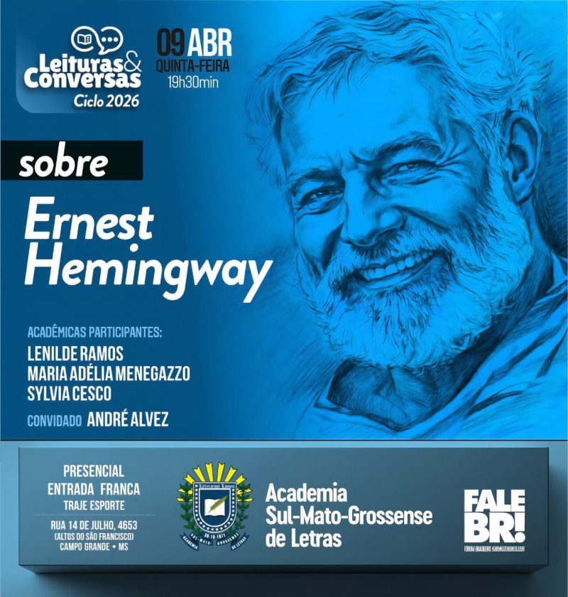 A Academia Sul-Mato-Grossense de Letras (ASL) realiza, neste mês de abril, mais uma edição do projeto Leituras & Conversas na ASL, desta vez dedicada à obra do escritor Ernest Hemingway. O encontro acontece na próxima quinta-feira, dia 9, às 19h30, no auditório da instituição, com entrada gratuita. A iniciativa promove reuniões mensais voltadas à leitura e discussão de autores consagrados, com programação prevista de março a novembro, este ano exceto no mês de julho.